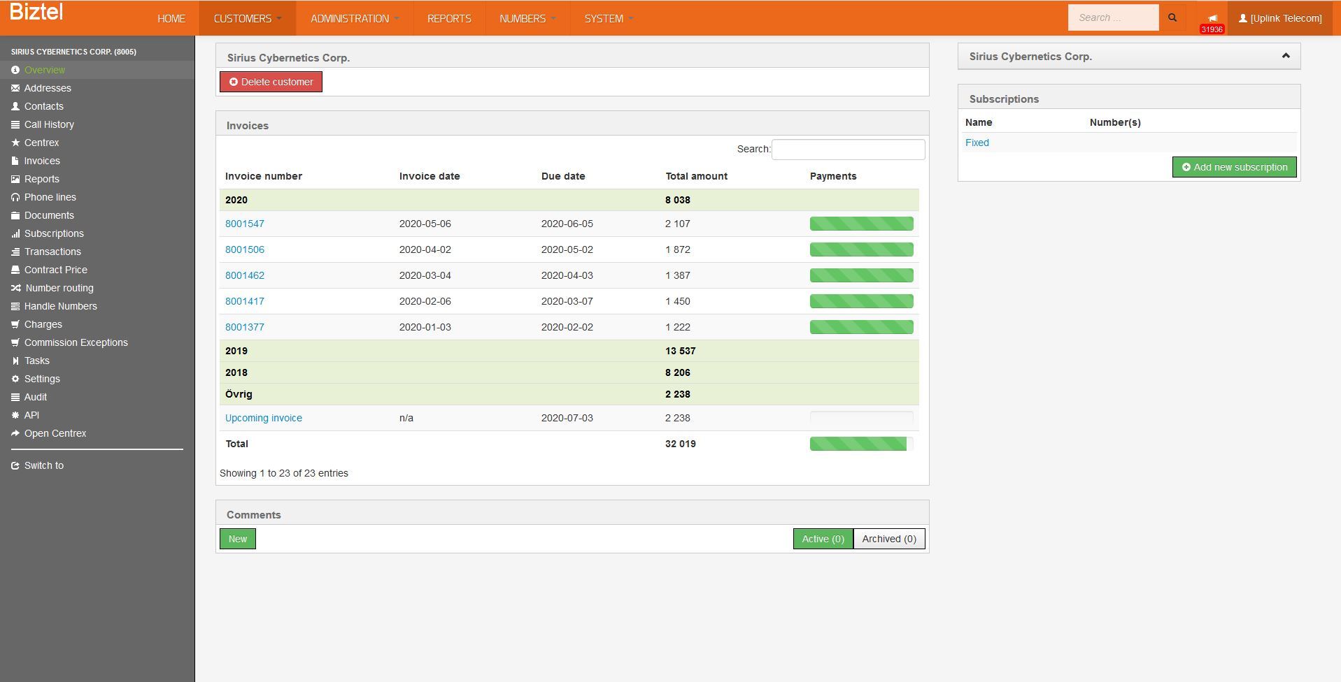 Genom vårat BSS (Business Support System) har du tillgång till alla funktioner och tjänster som du som återförsäljare behöver. Du skapar avtal och dokument för digital signering, uppdaterar och hanterar abonnemang (både mobila och fasta), hanterar PIN- och PUK-koder, blockering av internationella och betalsamtal. Du har tillgång till kundfakturor och kan snabbt hjälpa kunden med åtkomst via PDF eller direktlänk med krediter och korrigeringar direkt i BSS. Biztel hanterar all rådata för debitering av kunder, i början av månaden genereras fakturor automatiskt och kan redan inom några minuter vara redo för utskick.